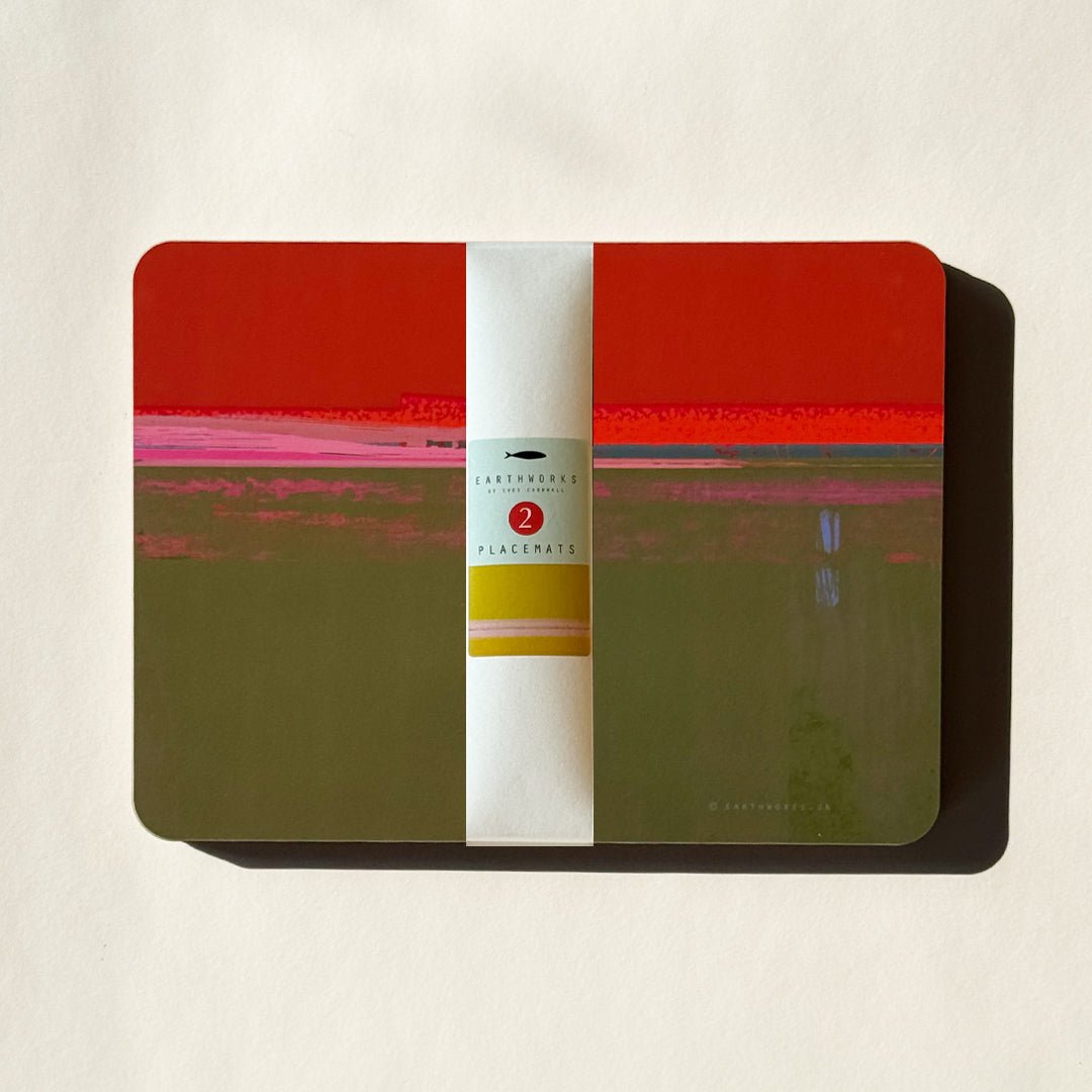 Gift Set of 2 high-quality placemats, "PATHS GREEN" design, paper-banded, tissue-wrapped, and packed in Kraft paper with a raffia tie and Earthworks gift postcard.